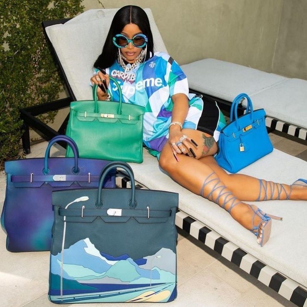 • Pasión por los Birkin: Cardi B también se ha convertido en referente del lujo en bolsos, llevando siempre un Birkin en alfombras rojas y eventos.